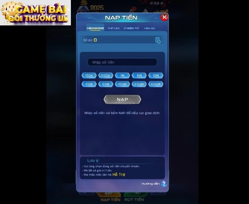 I-Banking là lựa chọn hàng đầu nhờ tốc độ xử lý tức thì và hạn mức giao dịch linh hoạt. Người chơi có thể nạp từ 10.000 VNĐ đến 500 triệu VNĐ, lý tưởng để tận dụng khuyến mãi 100% nạp đầu.